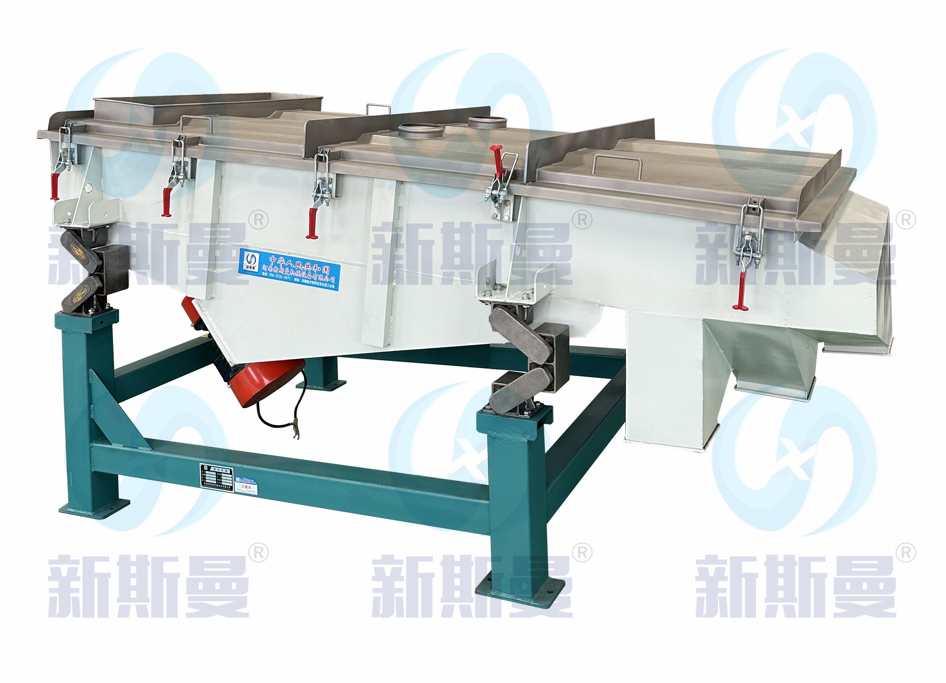 直线振动筛采用双振动电机驱动,当两台振动电机做同步、反缶旋转时,其偏心块所产生的激振力在平行于电机轴线的方向相互抵消,在垂直于电机轴的方向叠为一合力,因此振动筛的运动轨迹为一直线。其两电机轴相对筛面有一倾角,在激振力和物料自重力的合力作用下,物料在筛面上被抛起跳跃式向前作直线运动,从而达到对物料进行筛选和分级的目的。可用于流水线中实现自动化作业。具有能耗低、效率高、结构简单、易维修、全封闭结构无粉尘溢散的特点。筛分目数325目,可筛分出7种不同粒度的物料。