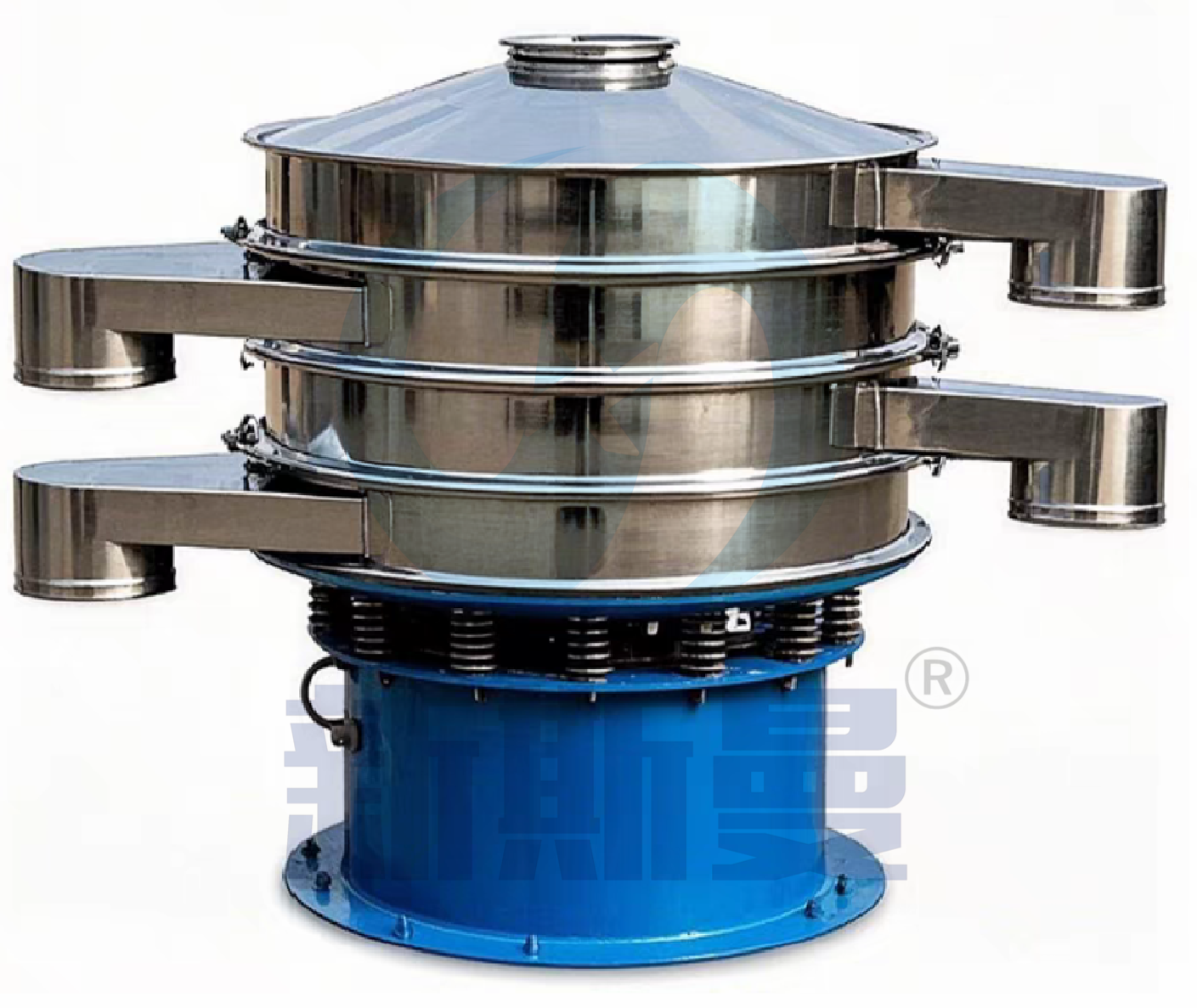 旋振筛是一种高精度细粉筛分机械,其噪音低、效率高,快速换网只需3-5分钟,全封闭结构,适用于粒、粉、粘液等物料的筛分过滤。旋振筛是由直立式振动电机作激振源,电机上、下两端安装有偏心重锤,将电机的旋转运动转变为水平、垂直、倾斜的三次元运动,再把这个运动传递给筛面。调节电机上、下两端的相位角,可以改变物料在筛面上的运动轨迹。
